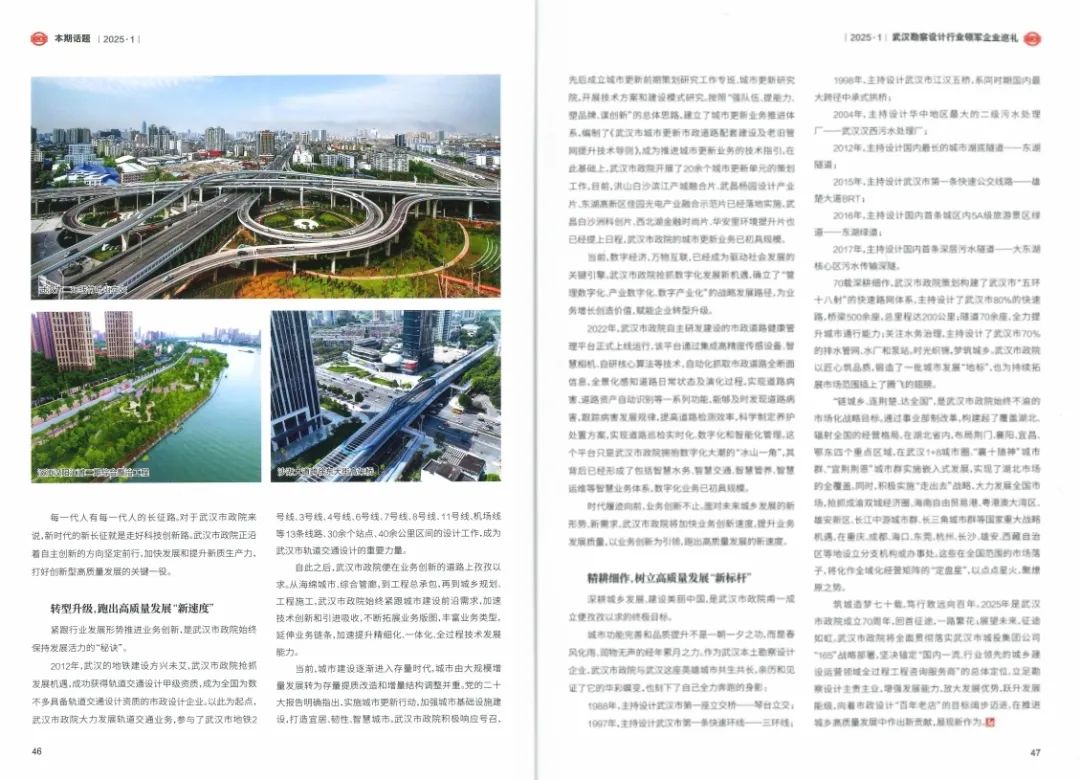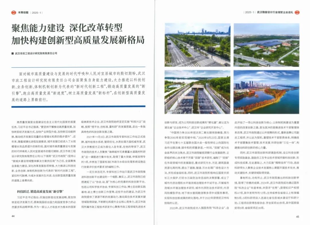 ? ? 近日,行業(yè)權(quán)威期刊《中國勘察設(shè)計(jì)》聚焦武漢勘察設(shè)計(jì)行業(yè),對(duì)領(lǐng)軍企業(yè)進(jìn)行了專題報(bào)道。其中,武漢市政工程設(shè)計(jì)研究院有限責(zé)任公司(以下簡稱“武漢市政院”)以“聚焦能力建設(shè),深化改革轉(zhuǎn)型,加快構(gòu)建創(chuàng)新型高質(zhì)量發(fā)展新格局”為主題,分享了其在新時(shí)代背景下的創(chuàng)新實(shí)踐和發(fā)展成果,展示了企業(yè)在高質(zhì)量發(fā)展道路上勇毅前行的風(fēng)采和活力,引發(fā)了行業(yè)廣泛關(guān)注。