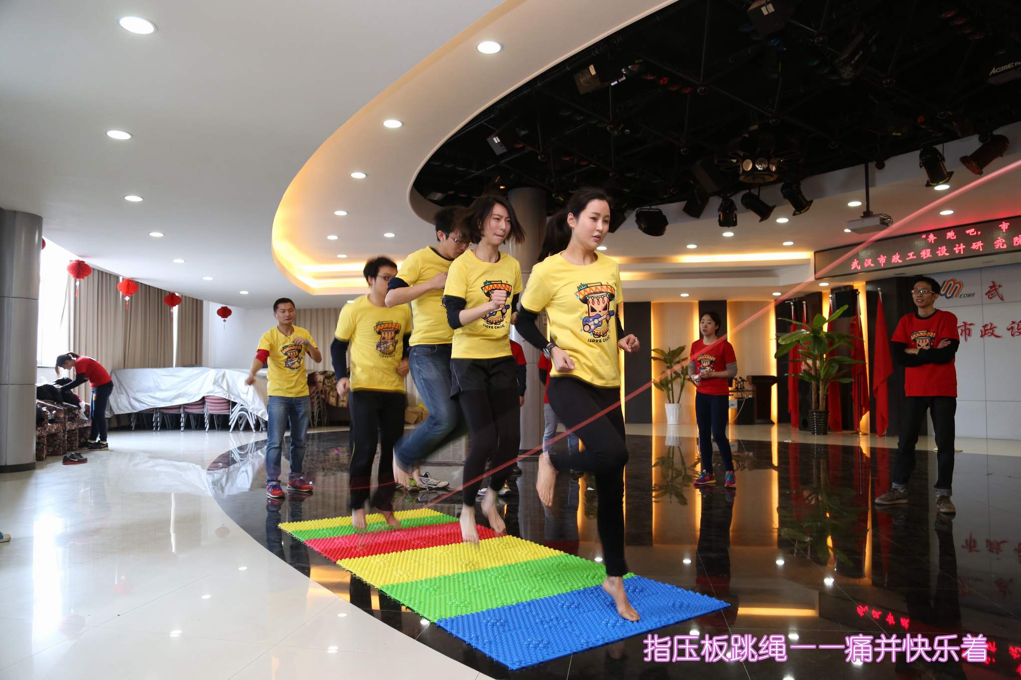 ??? 第三個環(huán)節(jié)是指壓板跳繩,每隊兩名隊員負責(zé)搖繩,四名隊員赤腳在指壓板上跳繩,四人同時完成10個用時最少的隊伍勝出。隊員們克服了指壓板帶來的疼痛,都圓滿的完成了比賽任務(wù),而綠隊再次以用時最少勝出,再次獲得一個錦囊。