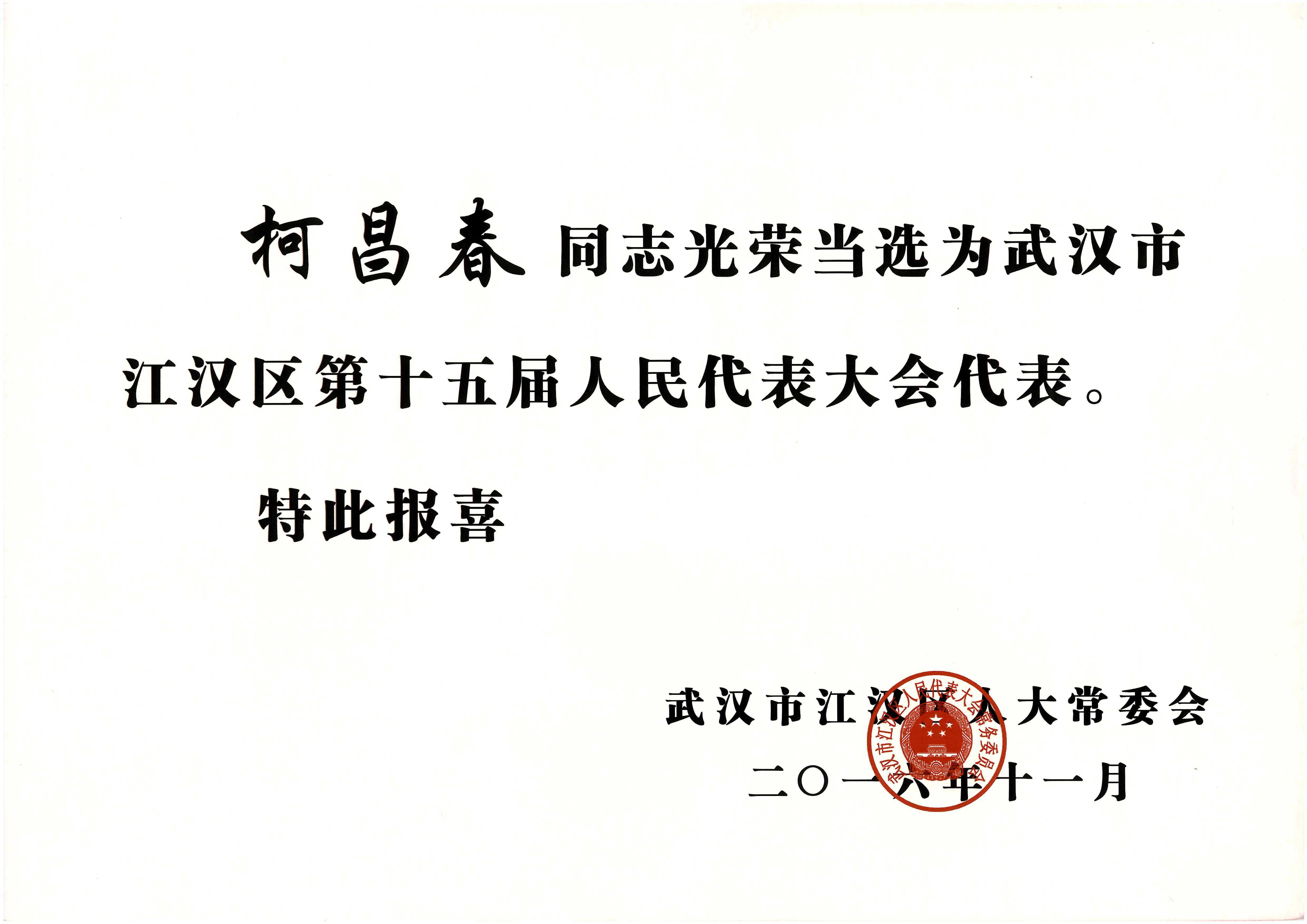 ??? 11月10日,江漢區(qū)進行了人大代表選舉,依法選舉產生了第十五屆人民代表大會代表,后經江漢區(qū)人大常委會確認,公司董事長柯昌春同志光榮當選為江漢區(qū)第十五屆人民代表大會代表。這也是他連續(xù)第二次當選為江漢區(qū)人大代表。