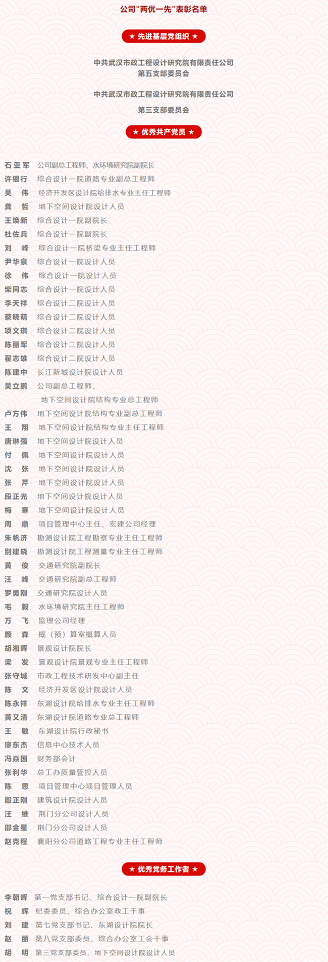 公司綜合設(shè)計(jì)一院道路專業(yè)副總工程師許銀行、經(jīng)濟(jì)開發(fā)區(qū)設(shè)計(jì)院給排水專業(yè)主任工程師吳偉、地下空間設(shè)計(jì)院設(shè)計(jì)人員龔哲榮獲市城投集團(tuán)公司“優(yōu)秀共產(chǎn)黨員”稱號;